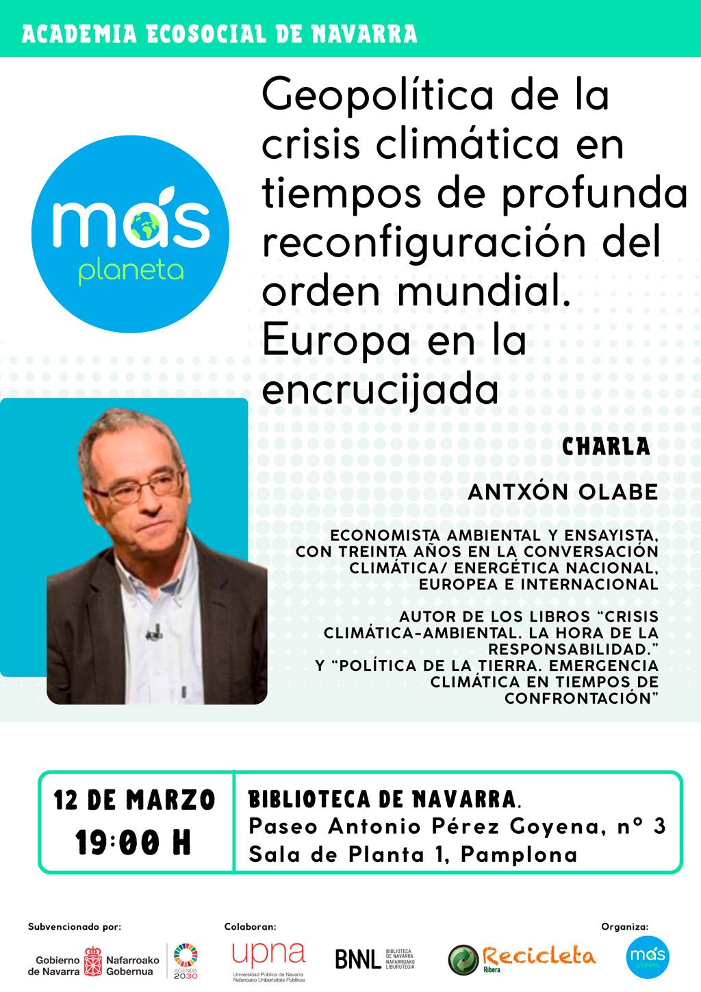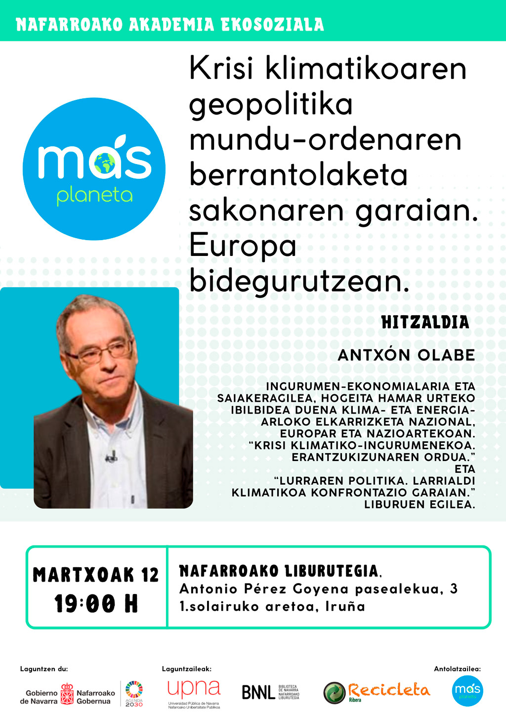 La asociación Más Planeta, junto a la UNED de Tudela, trae a Tudela al experto Aitor Sánchez.
