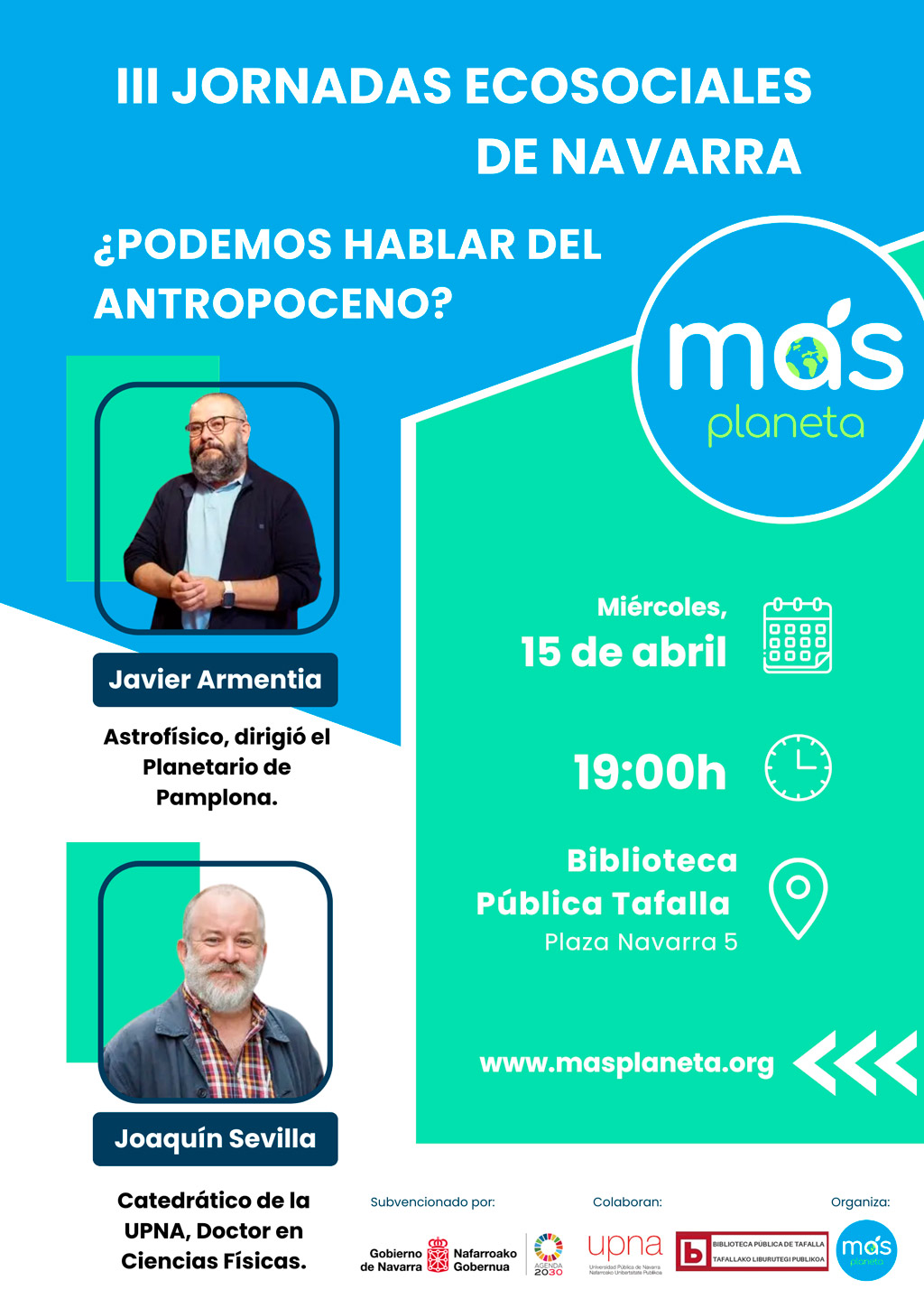 Desde esta joven asociación navarra, Más Planeta, queremos aportar nuestro granito de arena, organizando estas jornadas, descentralizadas, con actos en Tudela, Tafalla y Pamplona, a lo largo del mes de septiembre y octubre.