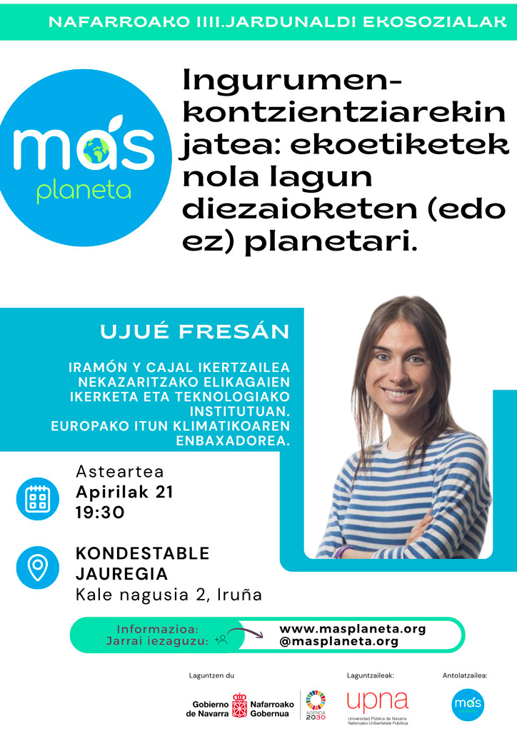 En esta sesión, Ujué Fresán nos hablará de la necesidad de contar con herramientas como las ecoetiquetas para guiar nuestras decisiones alimentarias en favor del medioambiente, de la ciencia que respalda su desarrollo y pondrá bajo la lupa las que actualmente encontramos en el mercado.