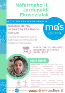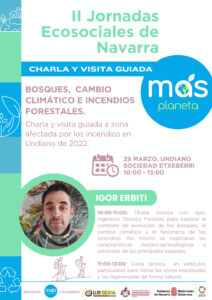 De 10 a 11 horas, en la Sociedad Etxeberri de Undiano. Charla teórica a cargo de Igor Erbiti para explicar el contexto de evolución de los bosques, cambio climático y el fenómeno de los incendios. Así mismo se explicarán las características botánicas ,ecológicas y selvícolas de las principales especies a visitar.