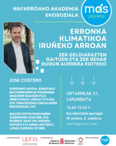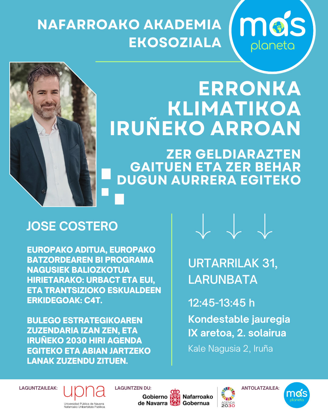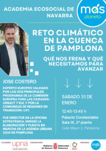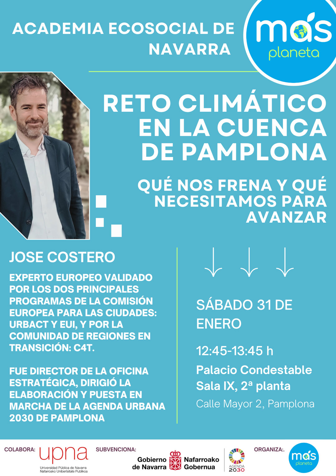 El cambio climático ya está transformando nuestra forma de vivir y las condiciones de nuestro entorno, y la Cuenca de Pamplona no es una excepción. Aunque contamos con planes, recursos y ciudadanía comprometida, seguimos avanzando más despacio de lo que exige la realidad climática. En esta charla exploraremos, con un lenguaje claro y accesible, qué está frenando la transformación de nuestra movilidad, nuestra energía y nuestros barrios, y por qué las soluciones actuales no siempre consiguen el impacto esperado.