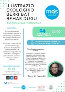 – La segunda, en el casco viejo de Pamplona-Iruña, el 14 de noviembre bajo la metodología de «Gastro-tertulia» en la Sociedad Zirimola Elkartea. Esta actividad en Pamplona-Iruña se realizó en colaboración con la Cátedra de Divulgación Científica de la UPNA.
